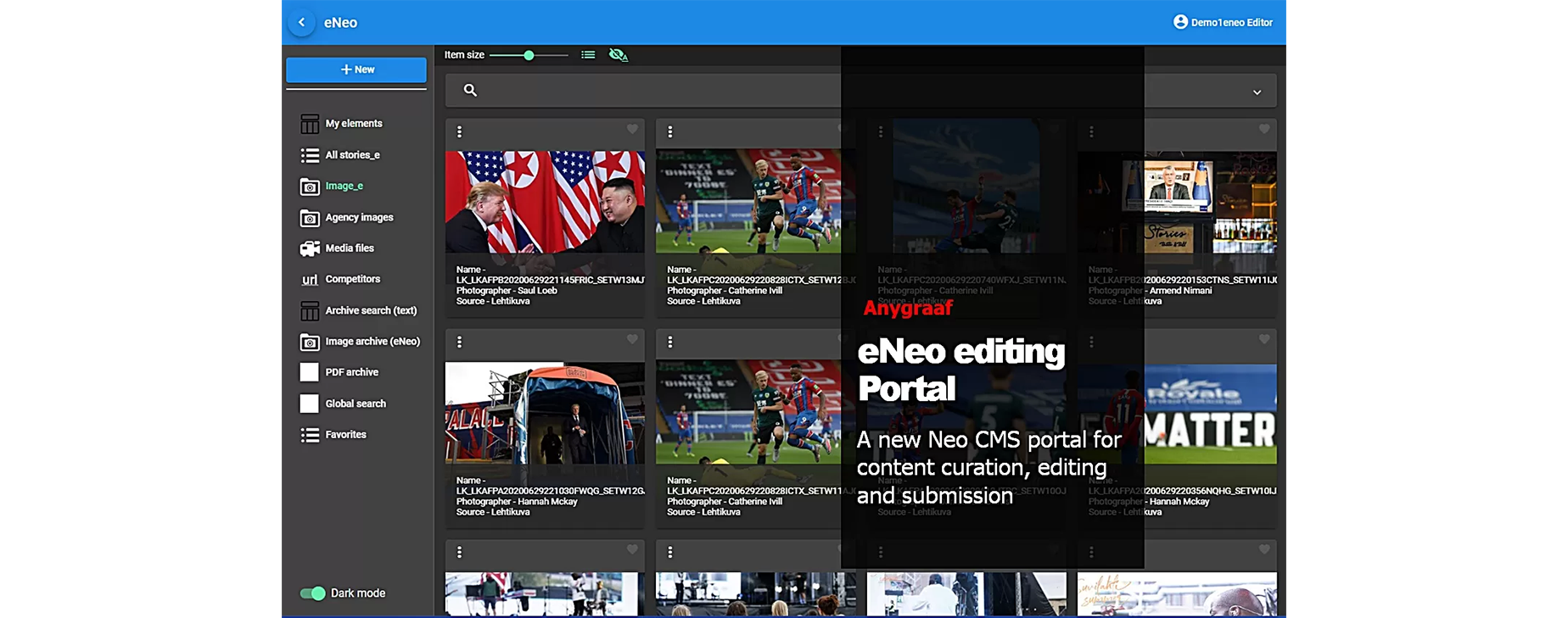 Direct access to archives Archival images, videos, graphics, and previously published content are easy to use, even as part of new content. Illustrating online news, social media campaigns, or audience writing does not require external image banks.