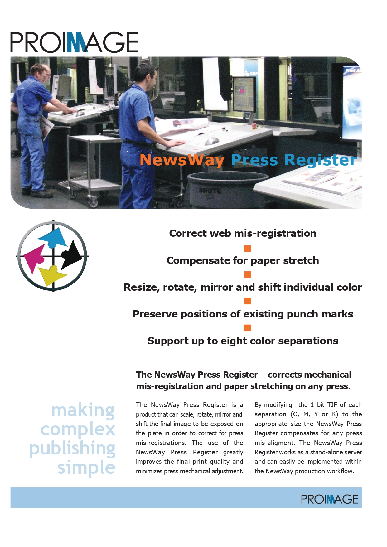 Press Register is a product which can scale, rotate, mirror and shift the final image to be exposed on the plate, in order to correct for press misregistrations. The use of NewsWay Press Register greatly improves the final print quality and minimizes press mechanical adjustment. Press Register corrects much more than simple FanOut.